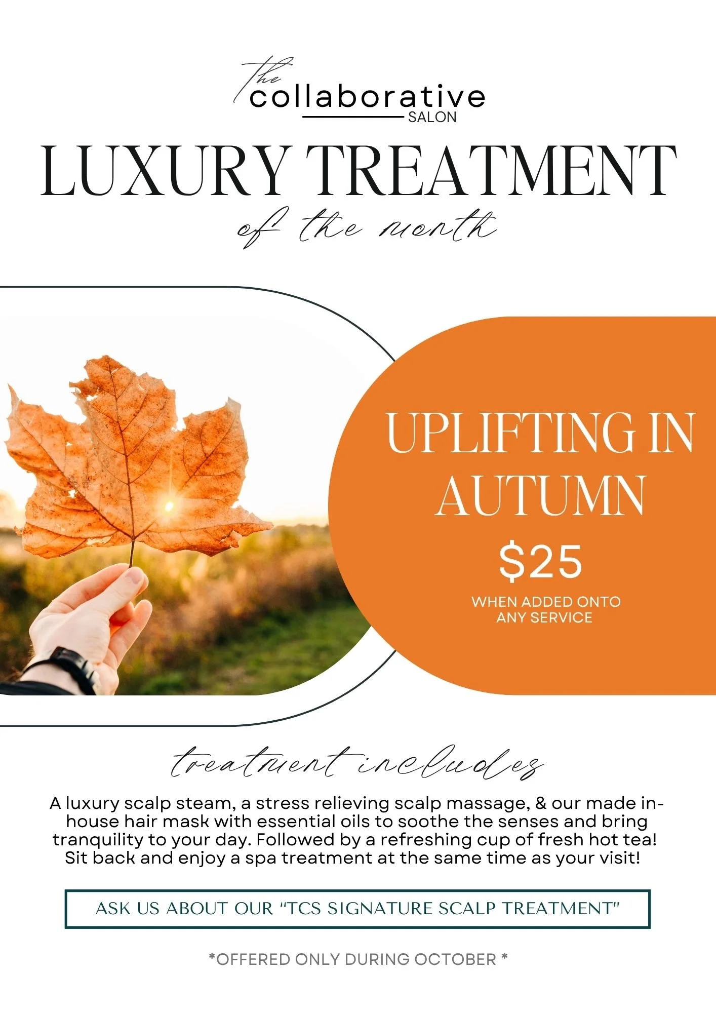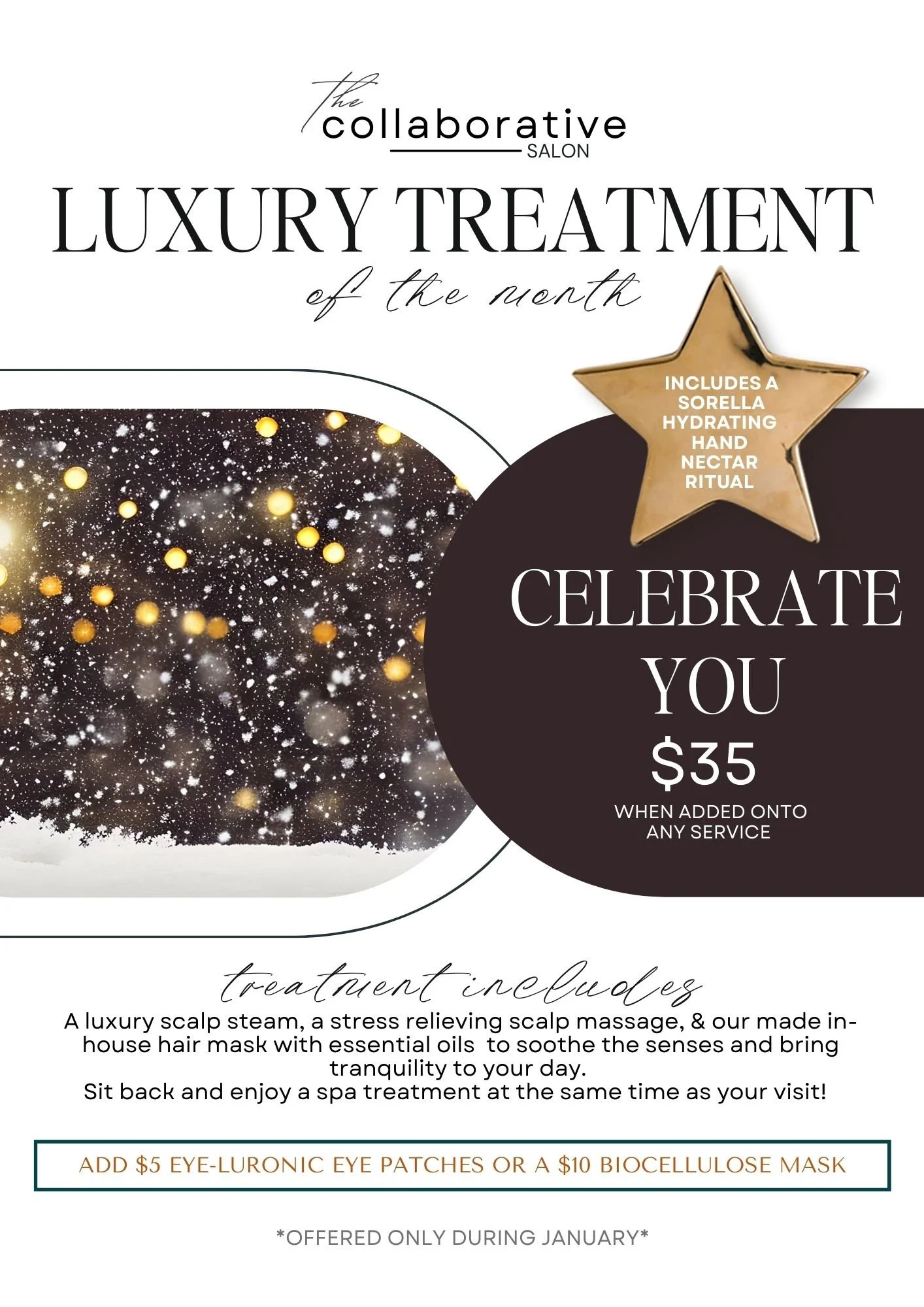 At The Collaborative Salon, we create the hair + skin you love! Each month we are bringing you a luxury hair treatment designed for the season. Enjoy a luxury spa treatment during your next visit.